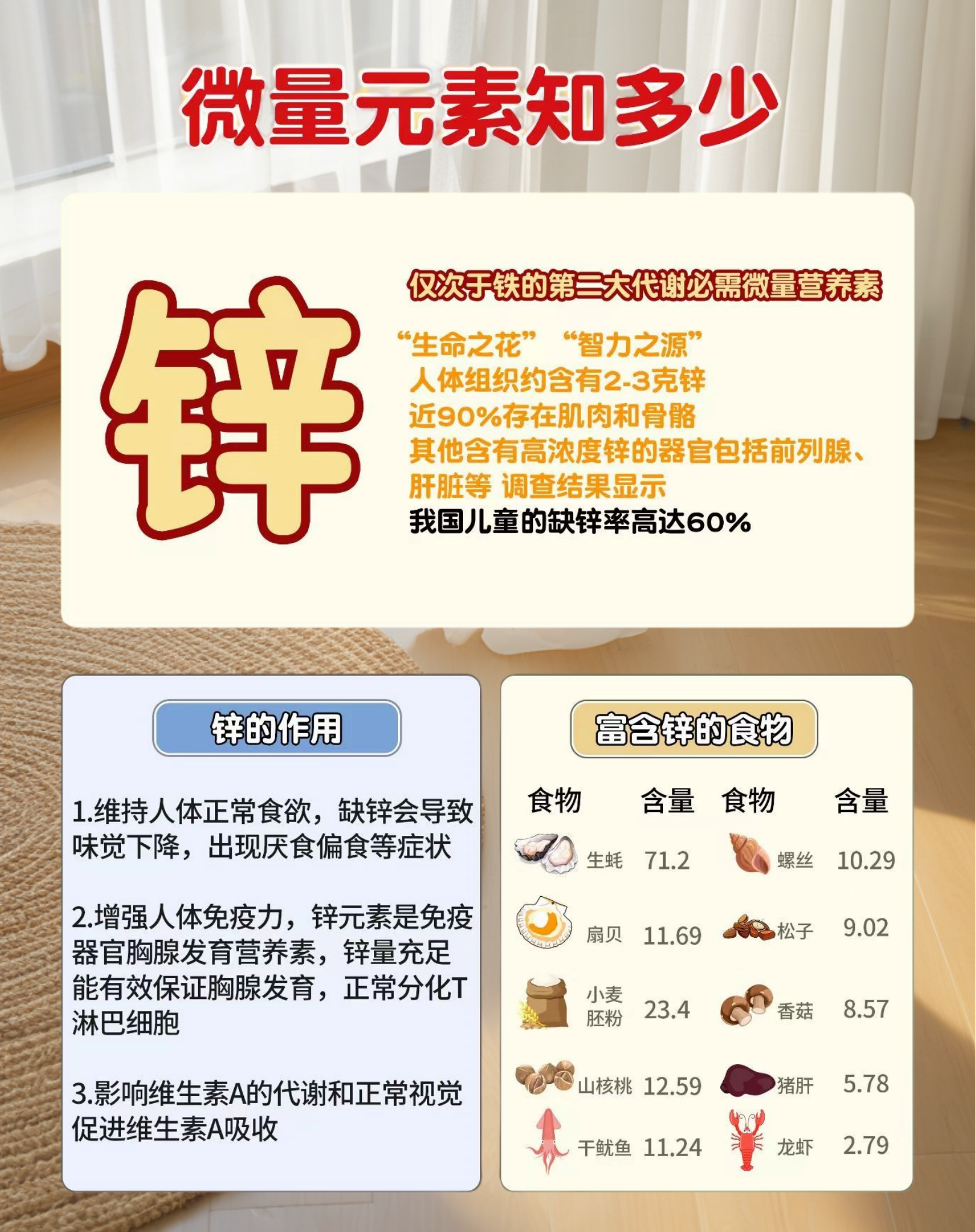 孩子体内有300多种酶的合成都需要锌,它还需要参与细胞分裂和组织修复,特别重要。